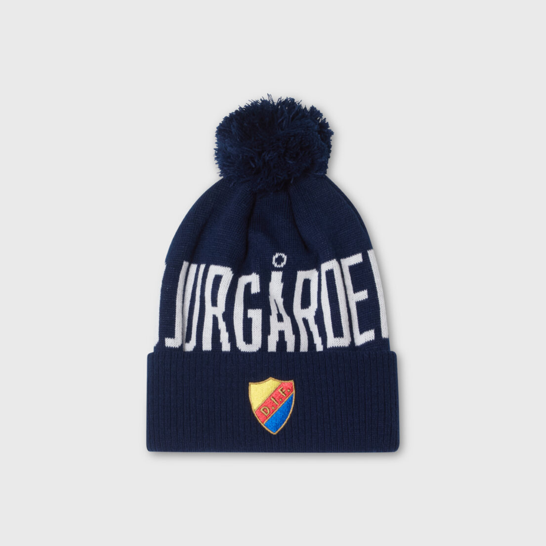 Mörkblå pom-mössa från CCM, utrustad med uppvikt kant med klassiska Djurgårdsskölden framtill. Mössan har en utmärkande vit “Djurgården”-texten som löper runt mössan som gör ditt supporterskap omöjligt att missa.