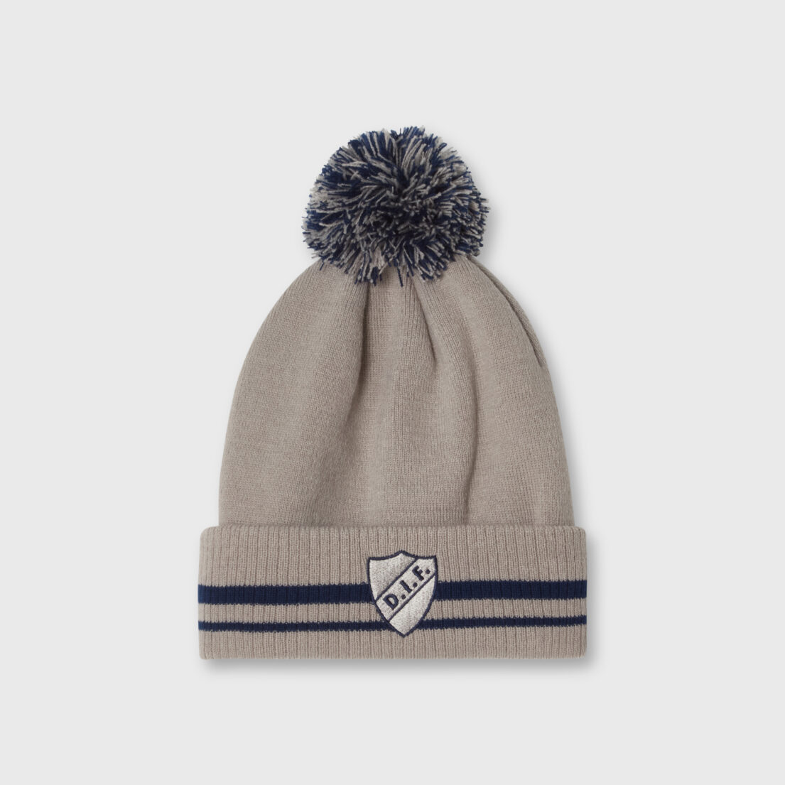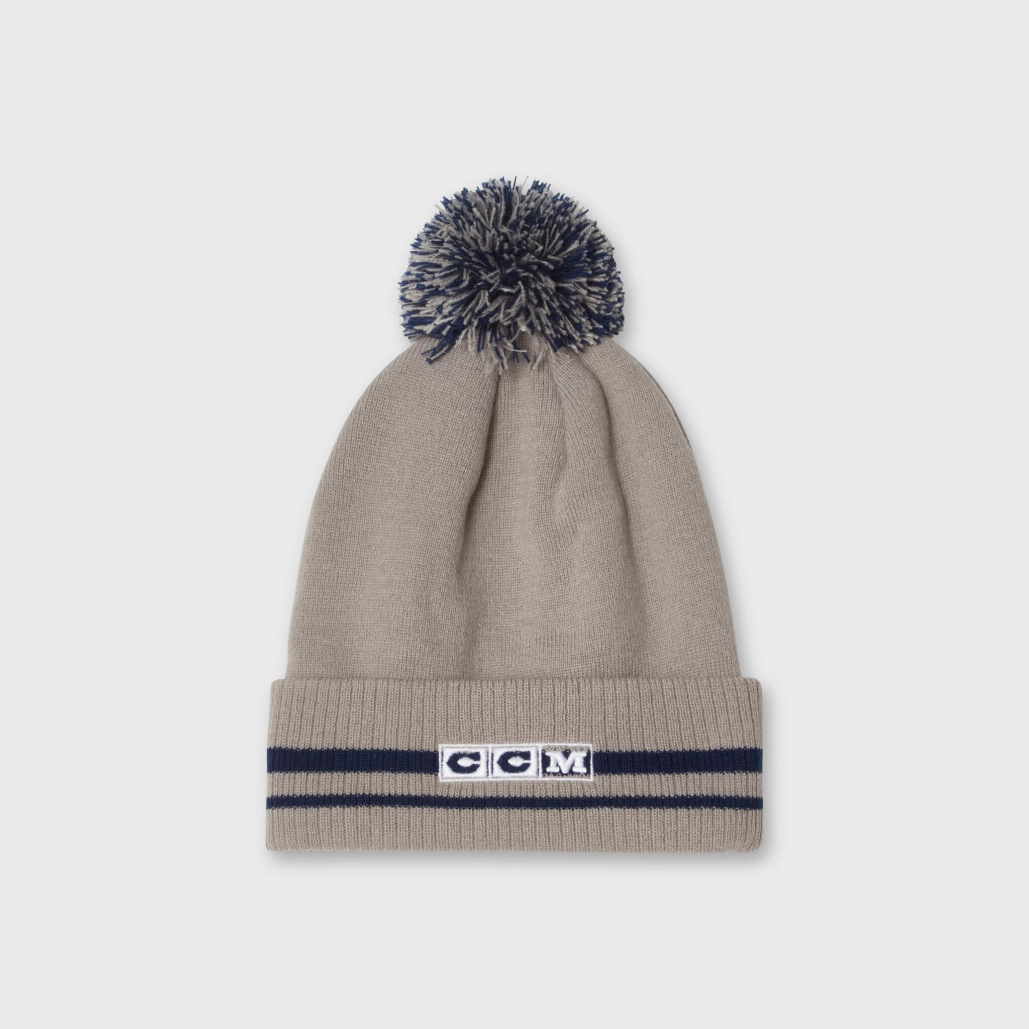 Grå pom-mössa från CCM, utrustad med uppvikt kant med mörkblå ränder som löper runt hela mössan och ger en sportig men stilren look. Den ljusbgråa outlineskölden framtill står i tydlig kontrast till den mörka färgen och ger ett diskret men exklusivt intryck.