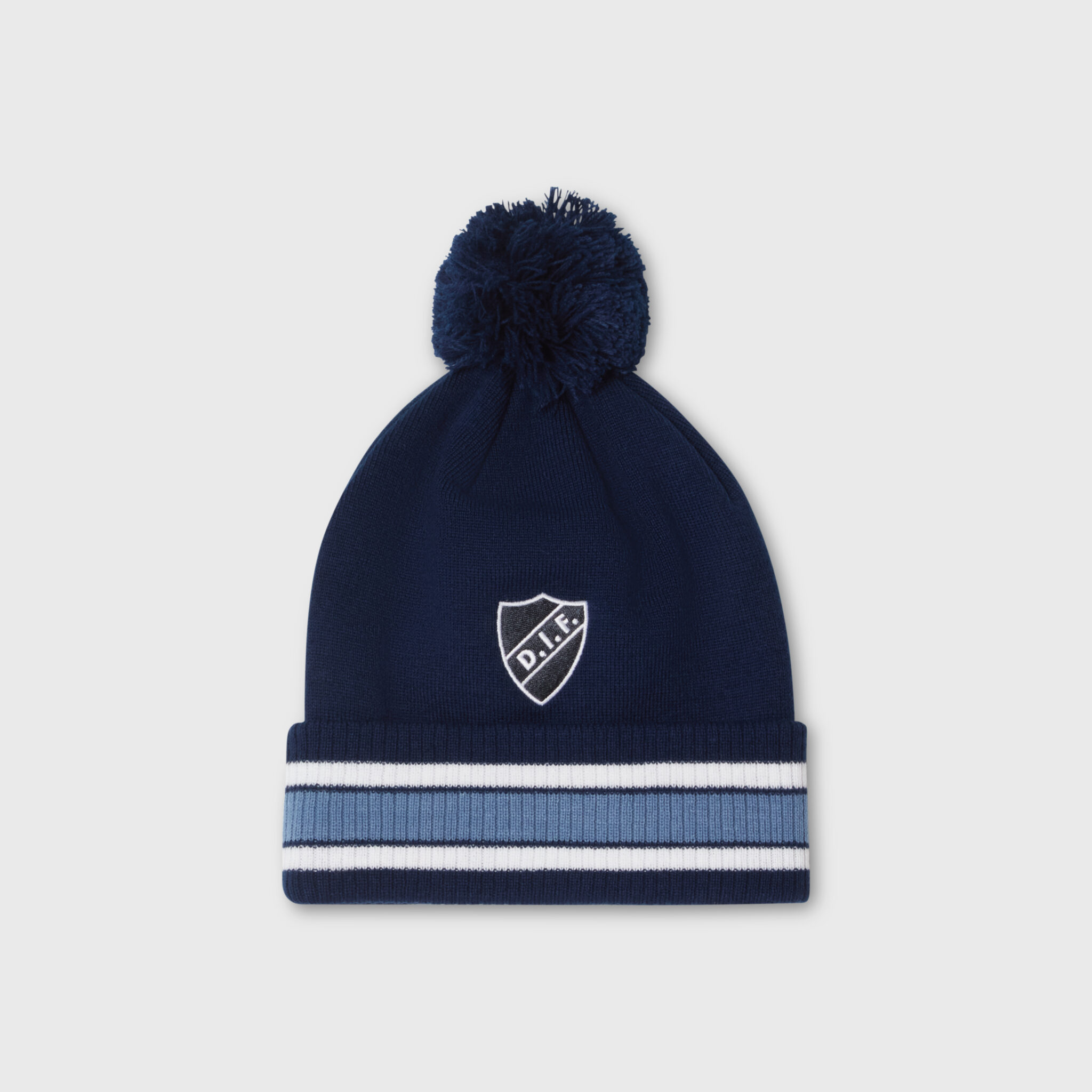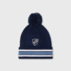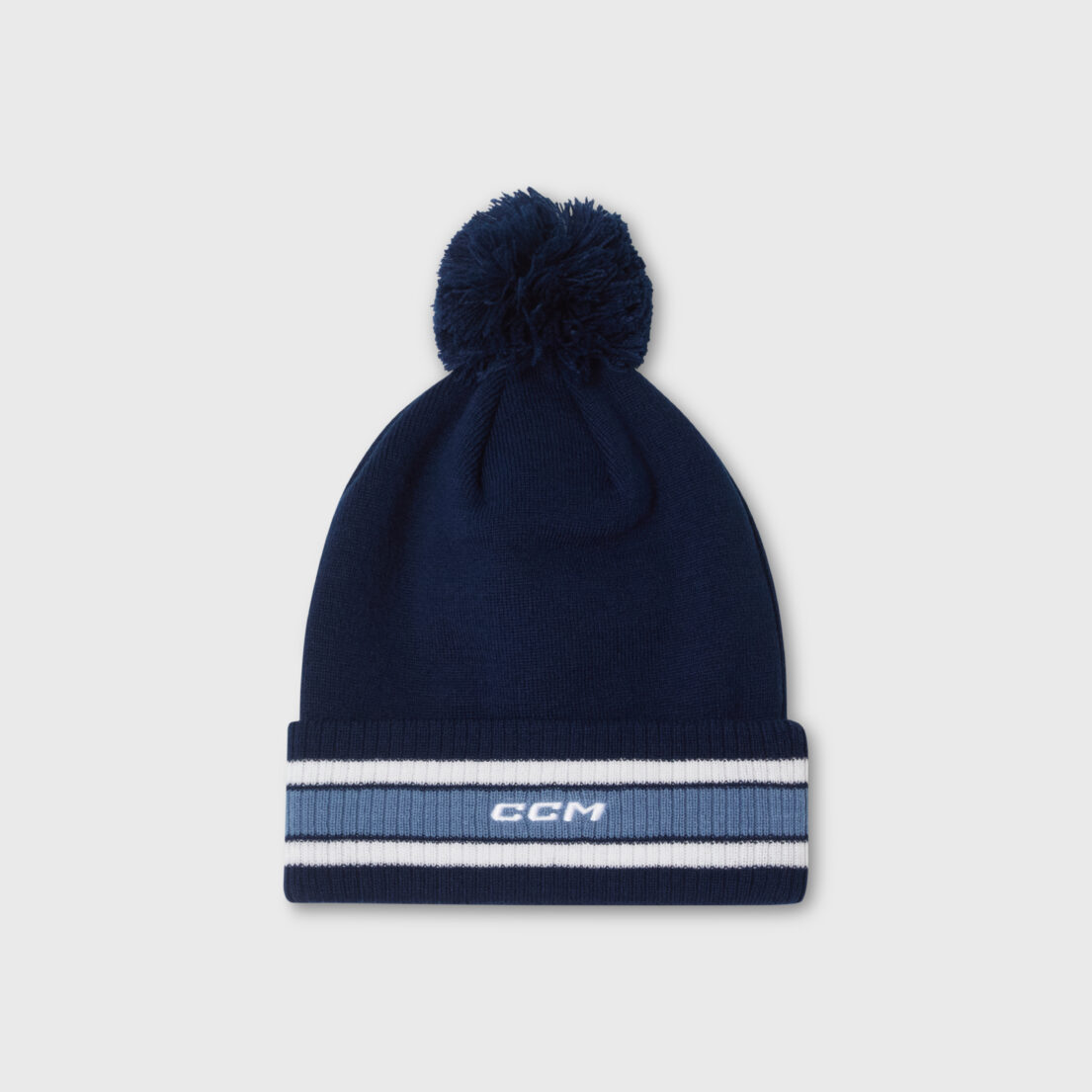 Mörkblå pom-mössa från CCM, utrustad med uppvikt kant med subtila ränder som löper runt hela mössan och en vit, stilren outlinesköld framtill. Perfekt för kyliga dagar utomhus eller när du hejar från läktaren.
