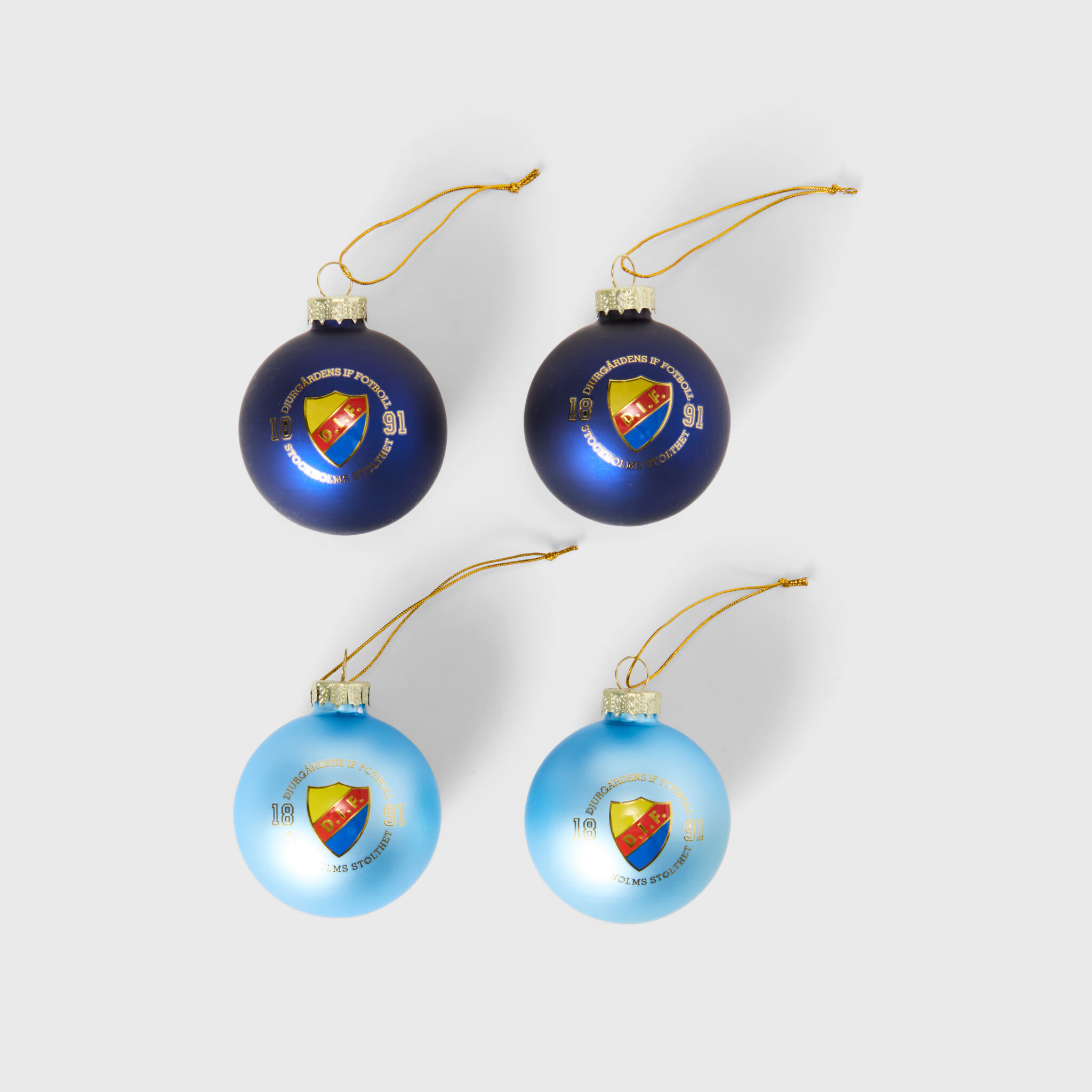 4-pack julgranskulor i glas med fotbollsinspirerad design: två matta i mörkblått och två matta i ljusblått, prydda med den klassiska Djurgårdsskölden. Perfekta att hänga i granen för en sportig julstämning eller att ge bort som den ultimata julklappen till en sann Djurgårdssupporter!