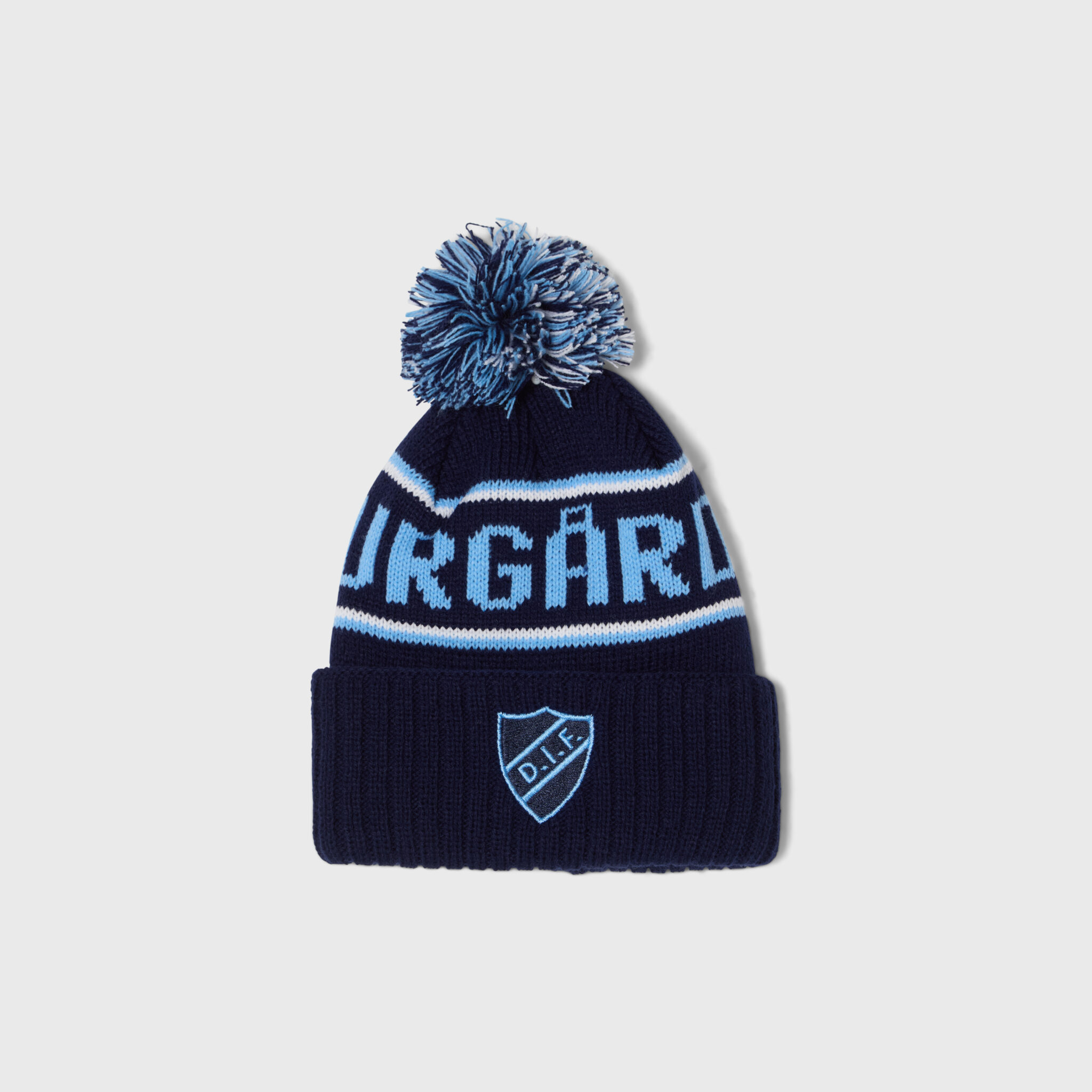 Blå POM-mössa för baby med ljusblå outlinesköld, blåvita ränder och en utmärkande “Djurgården”-text som löper runt mössan. Den mjuka tofsen i olika blå nyanser ger en mysig, vintrig känsla – perfekt för kalla dagar för de allra minsta supportrarna.