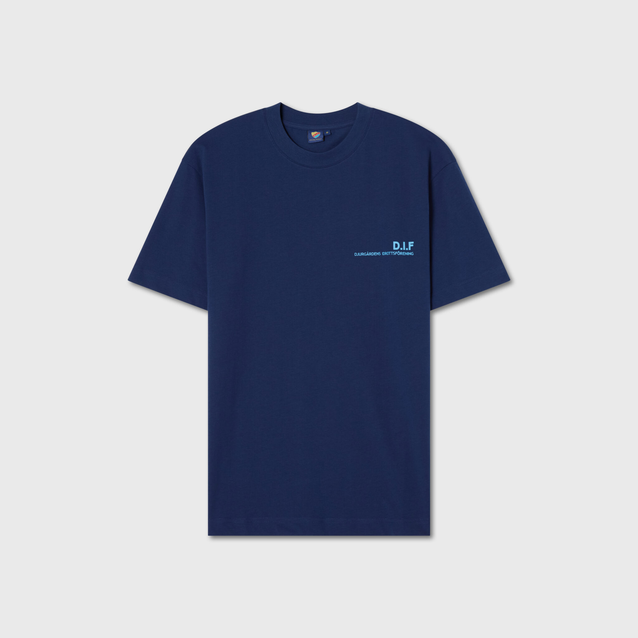 Stilren t-shirt i färgen navy med ett ljusblått brösttryck med texten D.I.F Djurgårdens Idrottsförening. Tillverkad i mjuk och slitstark bomull som ger en bekväm känsla hela dagen och passar perfekt på både matchdagar och till vardags.