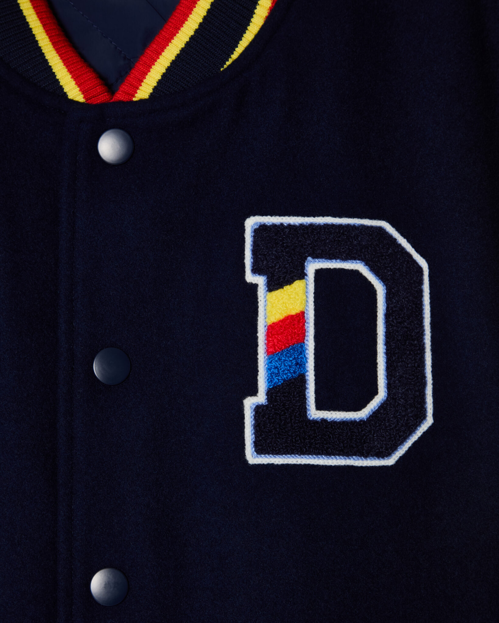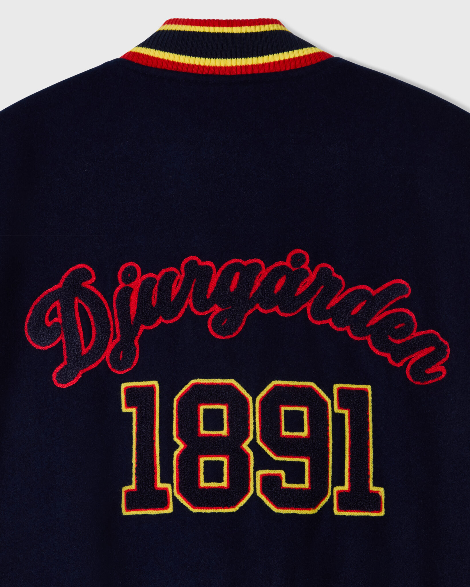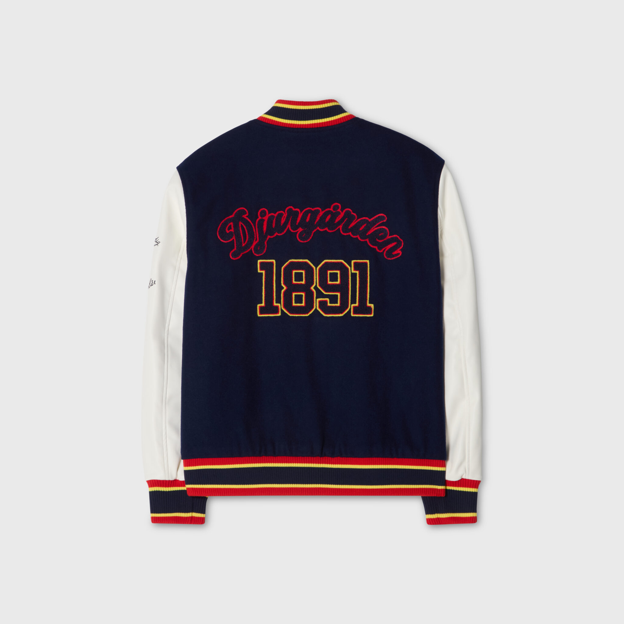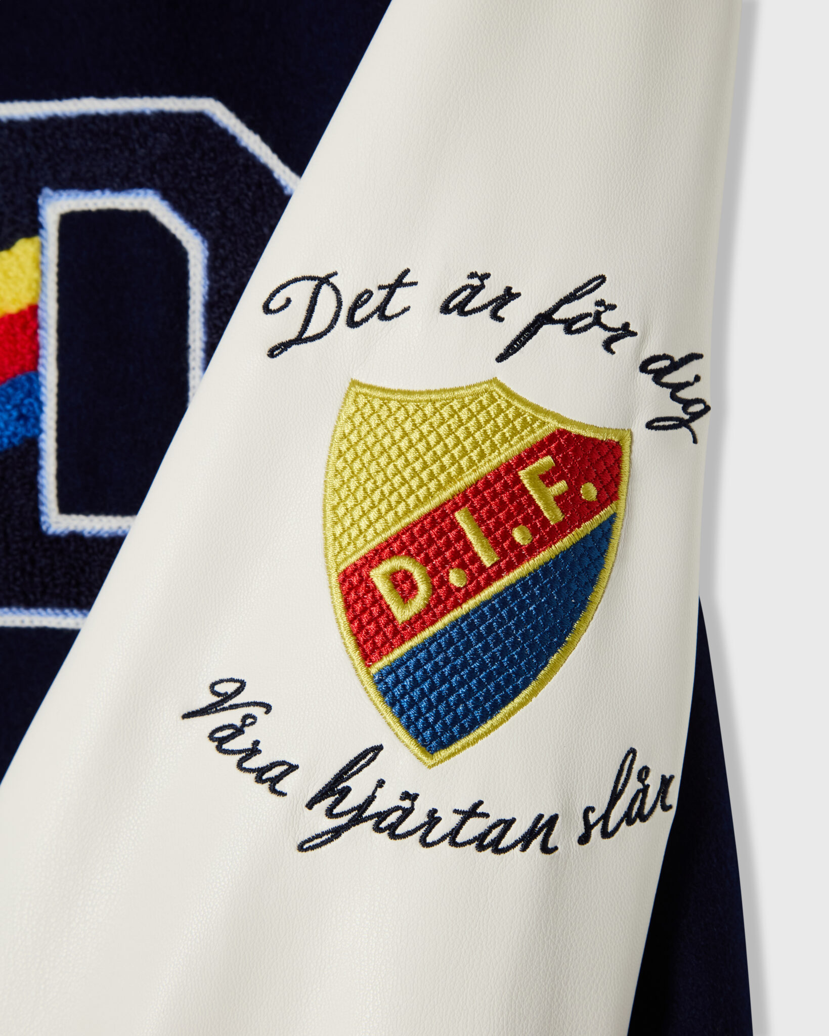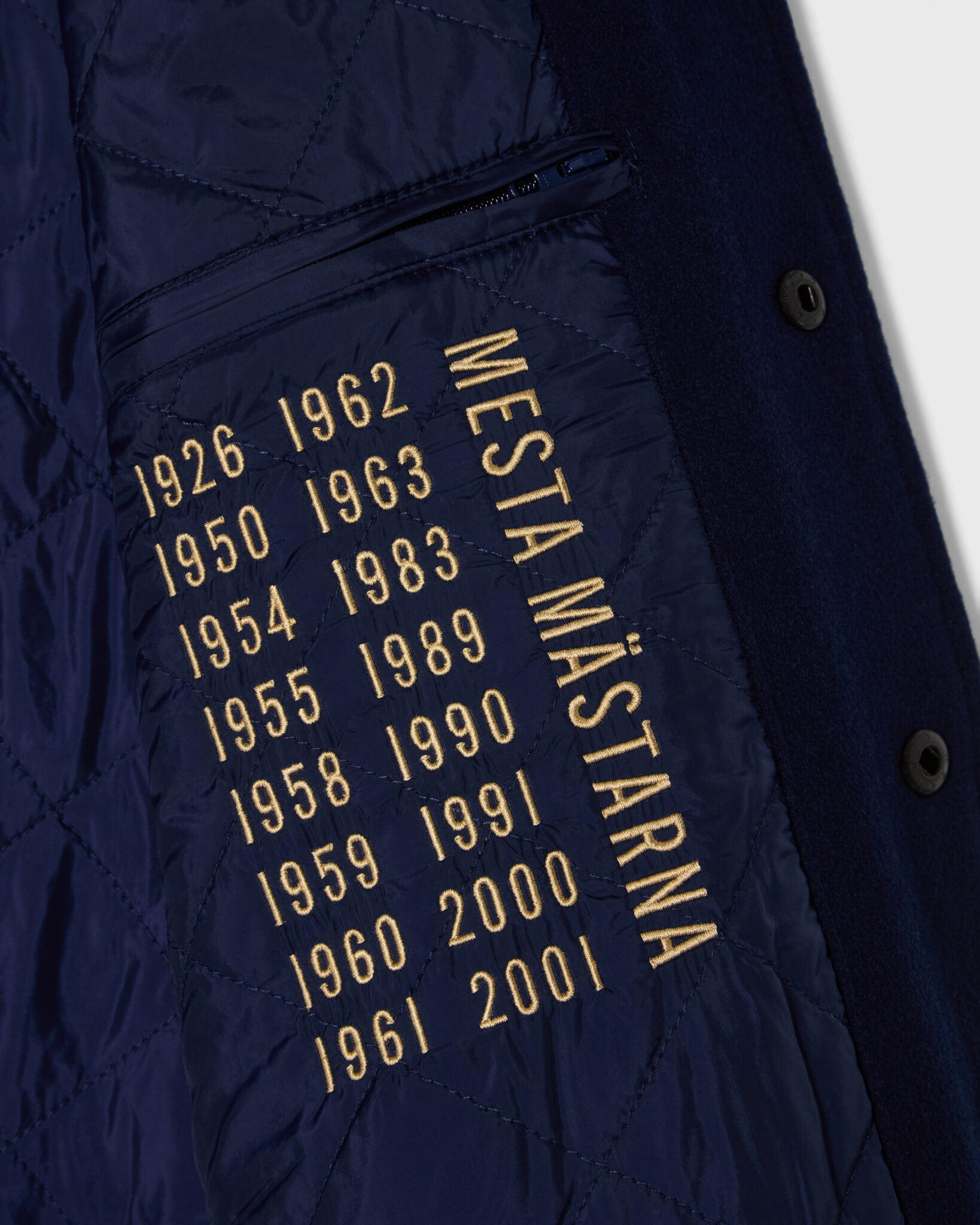 Exklusiv Varsity Hockey Jacket som kombinerar klassisk collegejacka-design med inspiration från hockeyns värld. Jackan är tillverkad i en ullblandning med kontrasterande ärmar i slitstark PU. Detaljrika broderier på framsidan, ärmarna och ryggen som förstärker klubbkänslan, medan insidan pryds av en listning över Djurgården Hockeys samtliga SM-guld – en hyllning till klubbens stolta och framgångsrika historia.