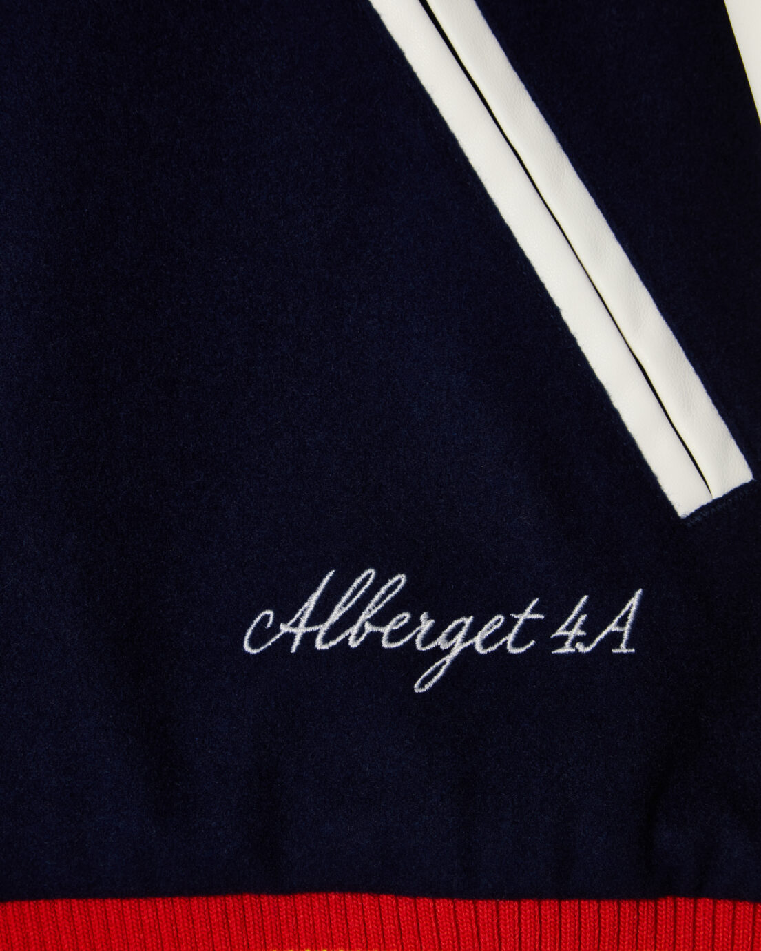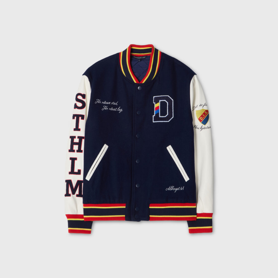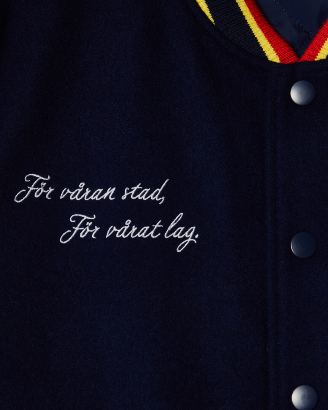 Exklusiv Varsity Hockey Jacket som kombinerar klassisk collegejacka-design med inspiration från hockeyns värld. Jackan är tillverkad i en ullblandning med kontrasterande ärmar i slitstark PU. Detaljrika broderier på framsidan, ärmarna och ryggen som förstärker klubbkänslan, medan insidan pryds av en listning över Djurgården Hockeys samtliga SM-guld – en hyllning till klubbens stolta och framgångsrika historia.