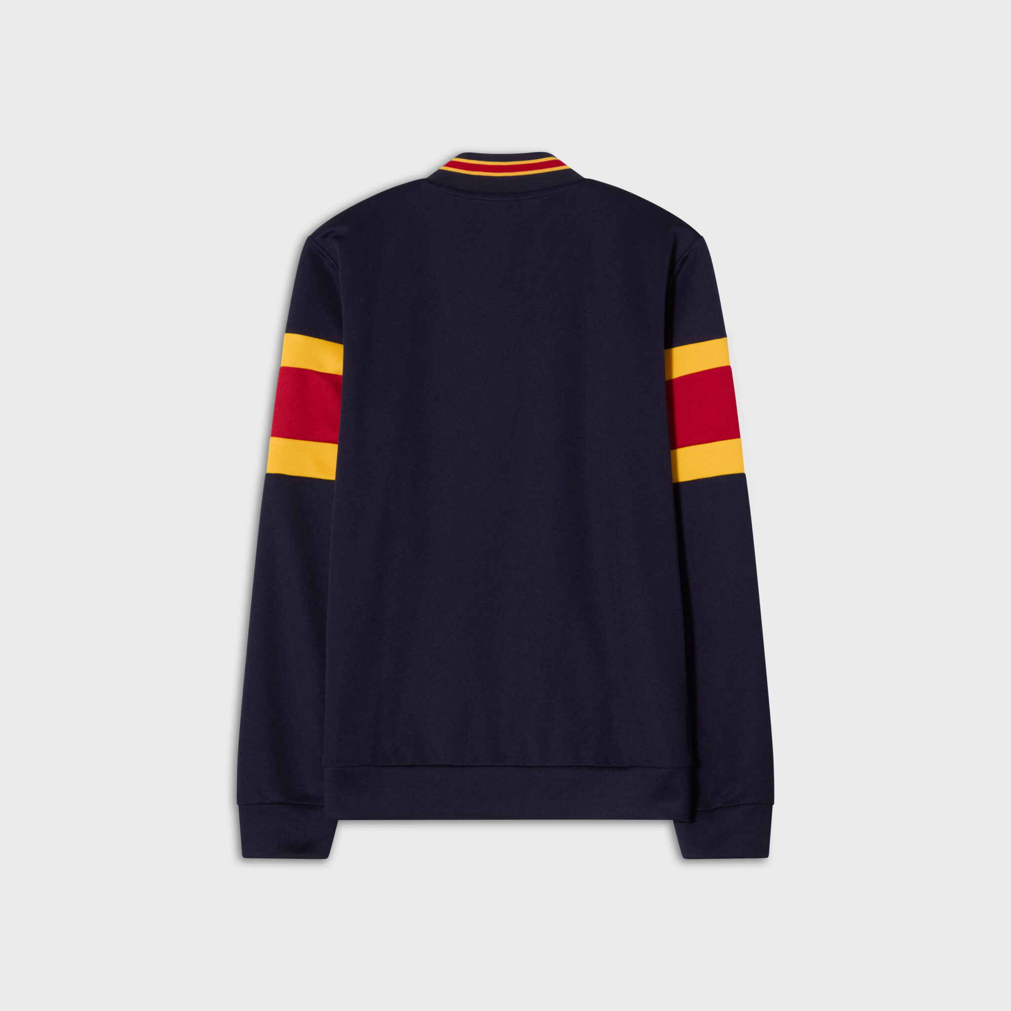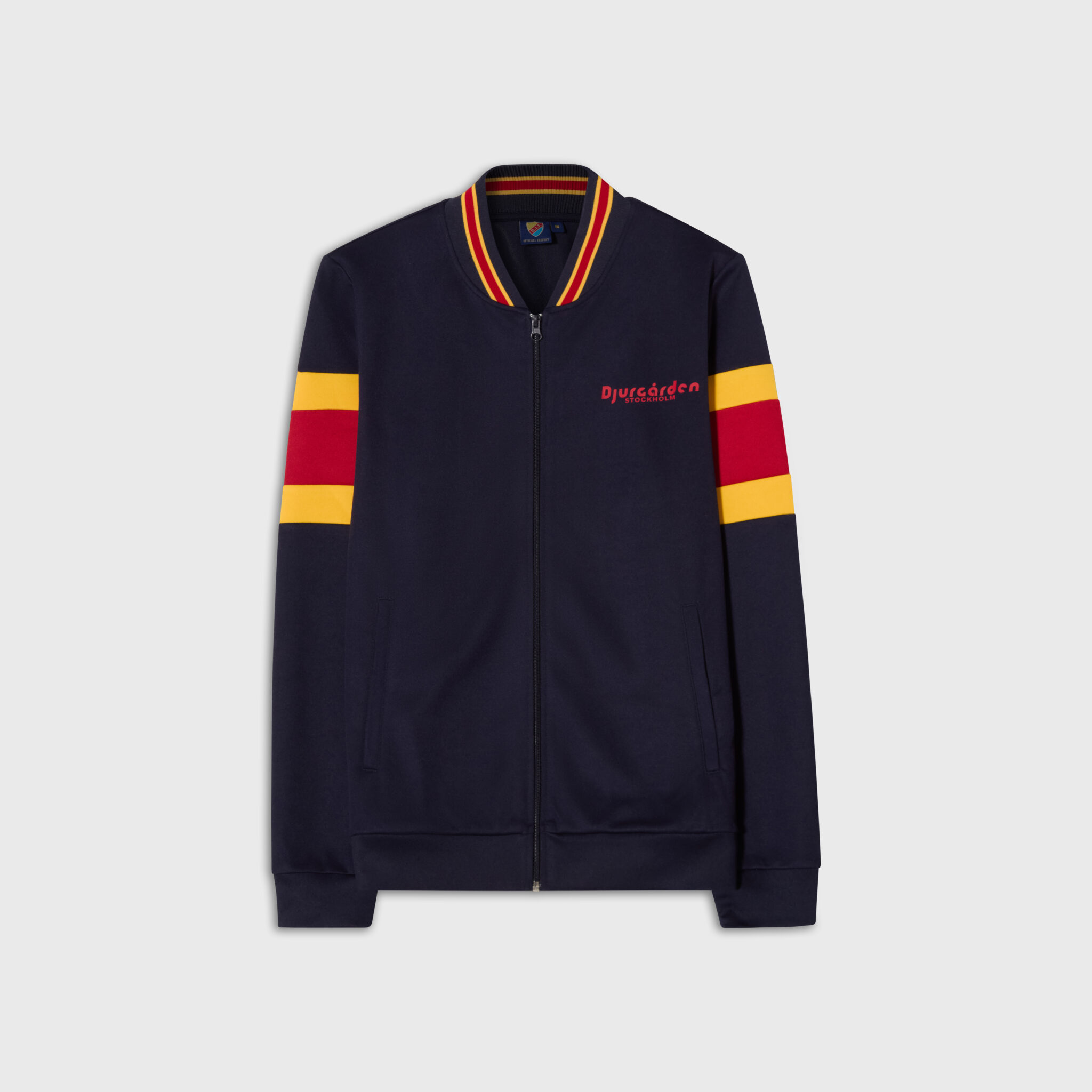 En modern och sportig WCT-ziptröja som kombinerar klassisk design med funktionella detaljer. Tröjan har en hel dragkedja framtill, två praktiska sidfickor och en ståkrage i retroinspirerade färger. På bröstet sitter en “Djurgården Stockholm”-text samt gul/röda ränder som löper runt tröjan och längs ärmarna, som ger ett stilrent och distinkt uttryck.