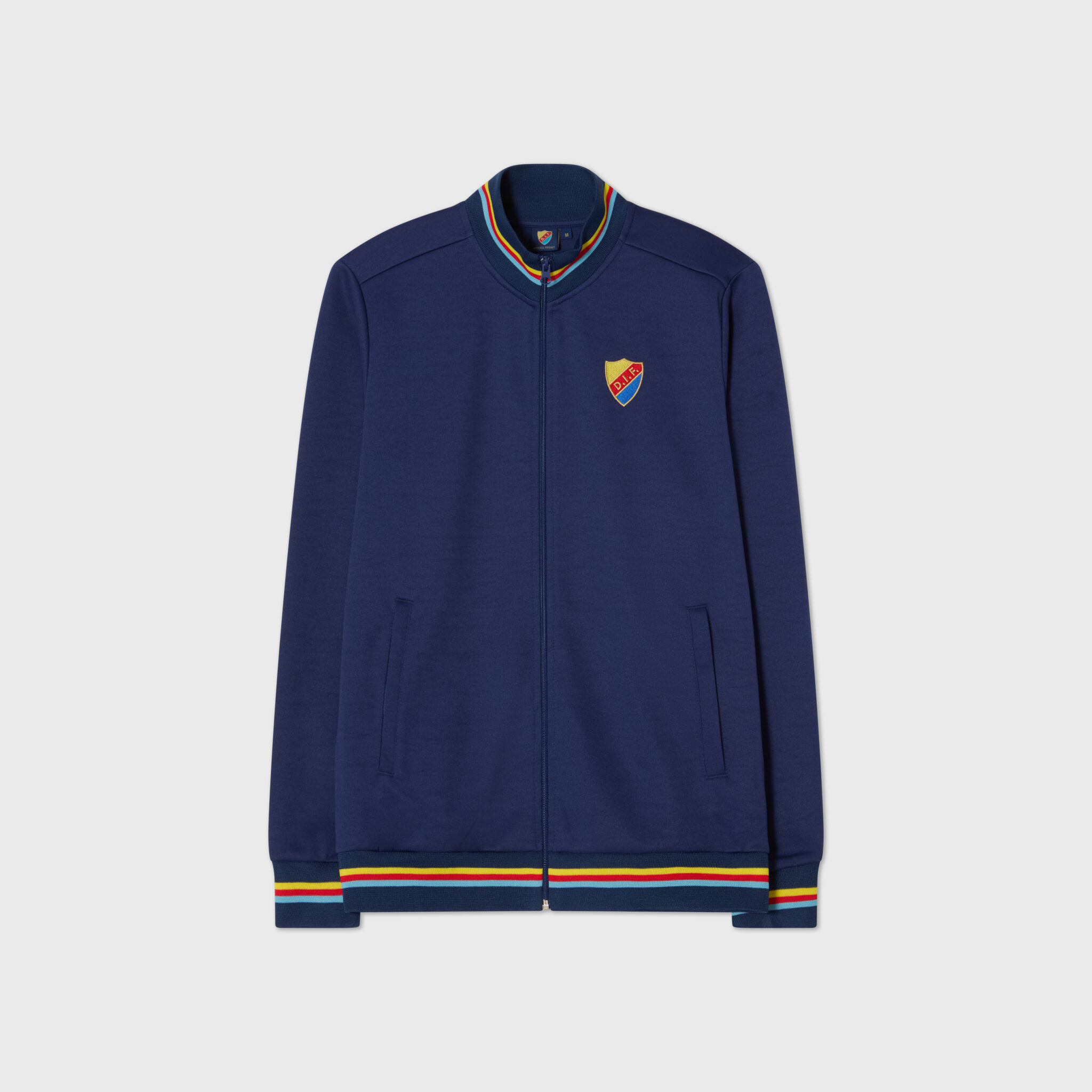WCT Tricolor Sköld är en klassisk marinblå ziptröja med randiga detaljer i Djurgårdsfärgerna längs ärmar, krage och nederkant. Den har hel dragkedja, två praktiska sidofickor, ståkrage och en broderad sköld på bröstet. Perfekt både till vardags och på matchdagar.