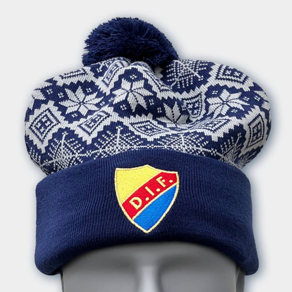 Marinblå mössa från CCM med smal, lång och toppig design. Mössan är detaljrik med vintrigt snöflingemönster, en broderad klassisk Djurgårdssköld på framsidan och en ljusblå broderad CCM-logga på baksidan.